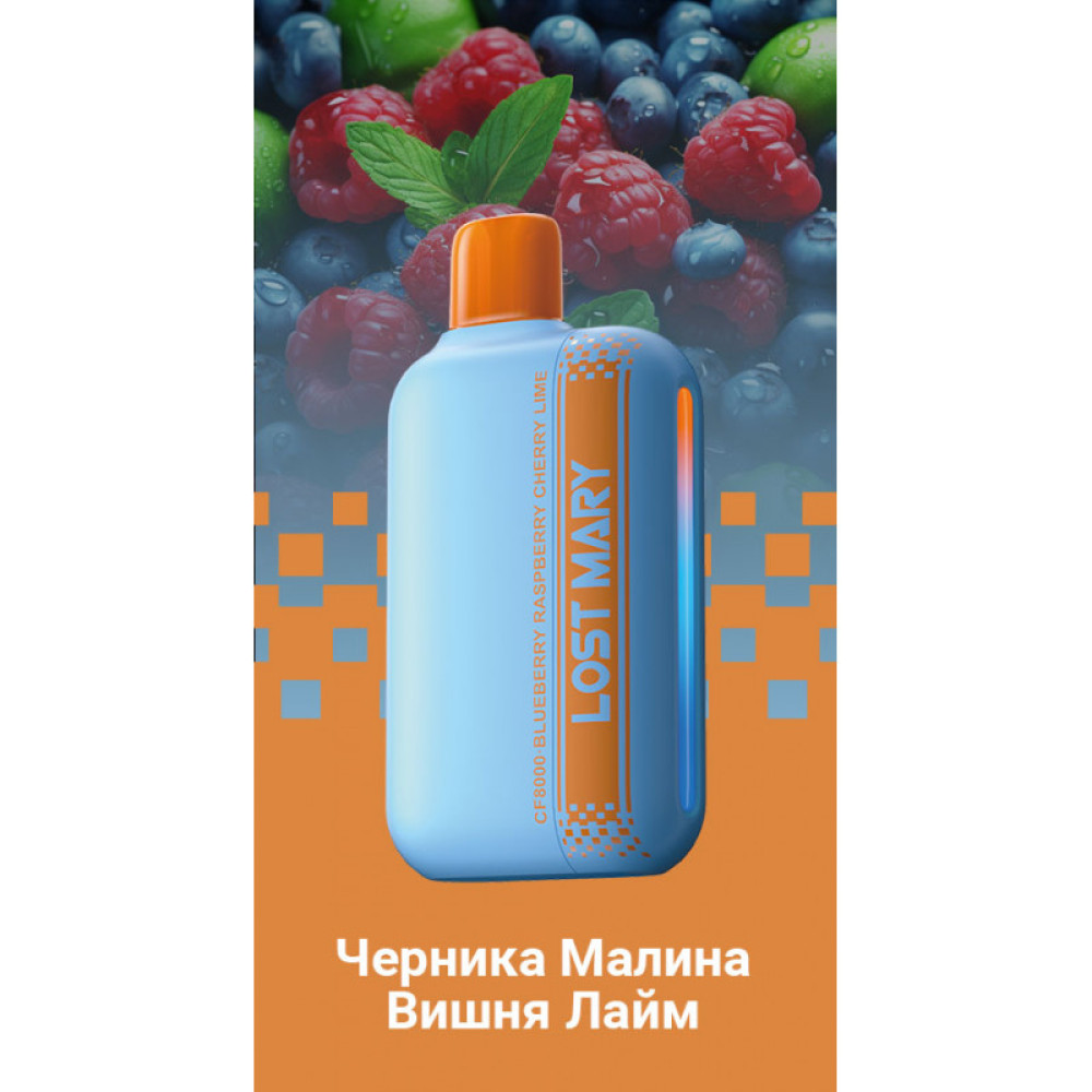 Купить электронную сигарету Lost Mary CF8000 Черника, Малина, Вишня, Лайм в магазине snusmsk – это отличный выбор для тех, кто предпочитает яркие и сочные фруктовые ароматы. Эта одноразовая электронная сигарета предлагает до 8000 затяжек, что обеспечивает продолжительное использование без необходимости дополнительной заправки или обслуживания. Вкус Черника, Малина, Вишня, Лайм объединяет в себе сладкие и кисловатые нотки, создавая яркий фруктовый букет. Ягоды черники, малины и вишни гармонично дополняются освежающими акцентами лайма, что делает парение насыщенным и приятным. Lost Mary CF8000 обеспечивает стабильное качество пара и насыщенный вкус на протяжении всего срока службы устройства. Магазин snusmsk предлагает только оригинальные электронные сигареты с гарантией качества. Приобретая Lost Mary CF8000 Черника, Малина, Вишня, Лайм в snusmsk, вы получаете современное устройство с привлекательным вкусом и большим ресурсом. Доставка осуществляется быстро и надежно, что обеспечивает удобство покупки и максимальное удовлетворение от использования. Выберите Lost Mary CF8000 для насыщенного и комфортного парения.