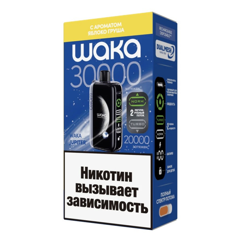 Waka Jupiter 30000 Яблоко Груша отличается стильным дизайном и компактными размерами, что делает устройство удобным для повседневного использования. Встроенный аккумулятор высокой емкости гарантирует стабильную работу на протяжении всего дня. Благодаря передовым технологиям в устройстве обеспечивается насыщенный вкус и качественный пар.